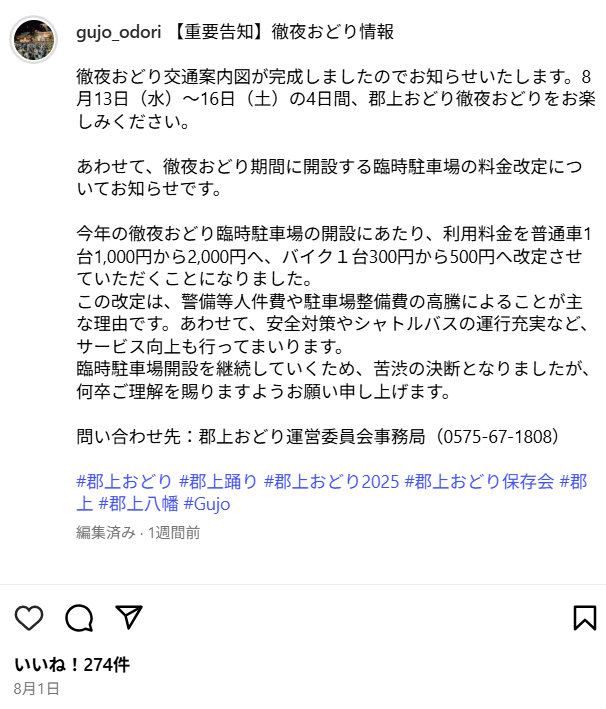 - 郡上市街地の道路は徹夜踊り期間中は交通規制が厳しく、路上駐車や会場周辺の迷惑駐車は厳禁です。