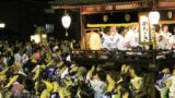 徹夜おどりでは、新町と橋本町の間にある四つ辻付近にやぐら(お囃子台)が設置され、その周囲を中心に踊りの輪が広がっていきます。参加者はやぐらを軸に、円を描くように回りながら踊るため、踊っているうちに自然と位置が少しずつ動いていくのが特徴です。